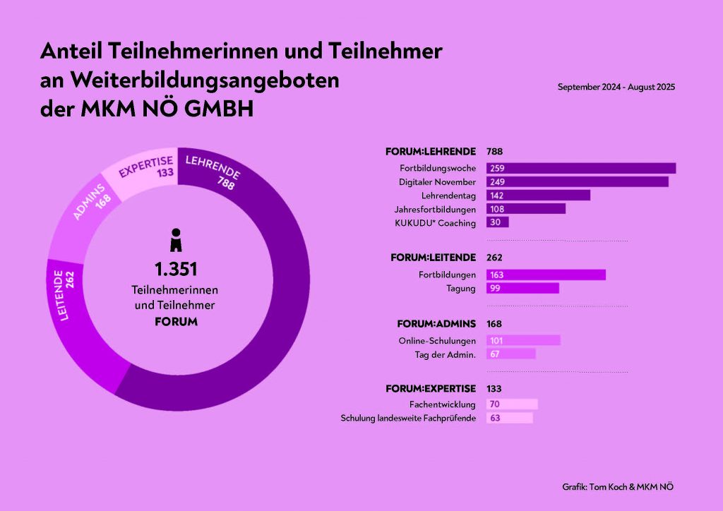Durch die klare Ansprache der Zielgruppen (Lehrende, Leitende, Admins) und eine Ausweitung des Angebots konnte die Zahl der Teilnehmenden an Fortbildungen gesteigert werden. Im Jahr 2022/23 wurden noch reine Lehrendenfortbildungen angeboten, die von 670 Personen besucht wurden. Im Jahr 2024 erweiterte das MKM NÖ sein Angebot auf Leitende und Admins, woraufhin schon 1290 Teilnehmende begrüßt werden konnten. Das Schuljahr 2024/25 bildete den bisherigen Höhepunkt mit 1351 Musikschulbediensteten, die eine Weiterbildung besucht haben. Auch im laufenden Schuljahr 2025/26 sind die Fortbildungen gut angelaufen, vor allem die Angebote im „Digitalen November“ wurden stark nachgefragt.