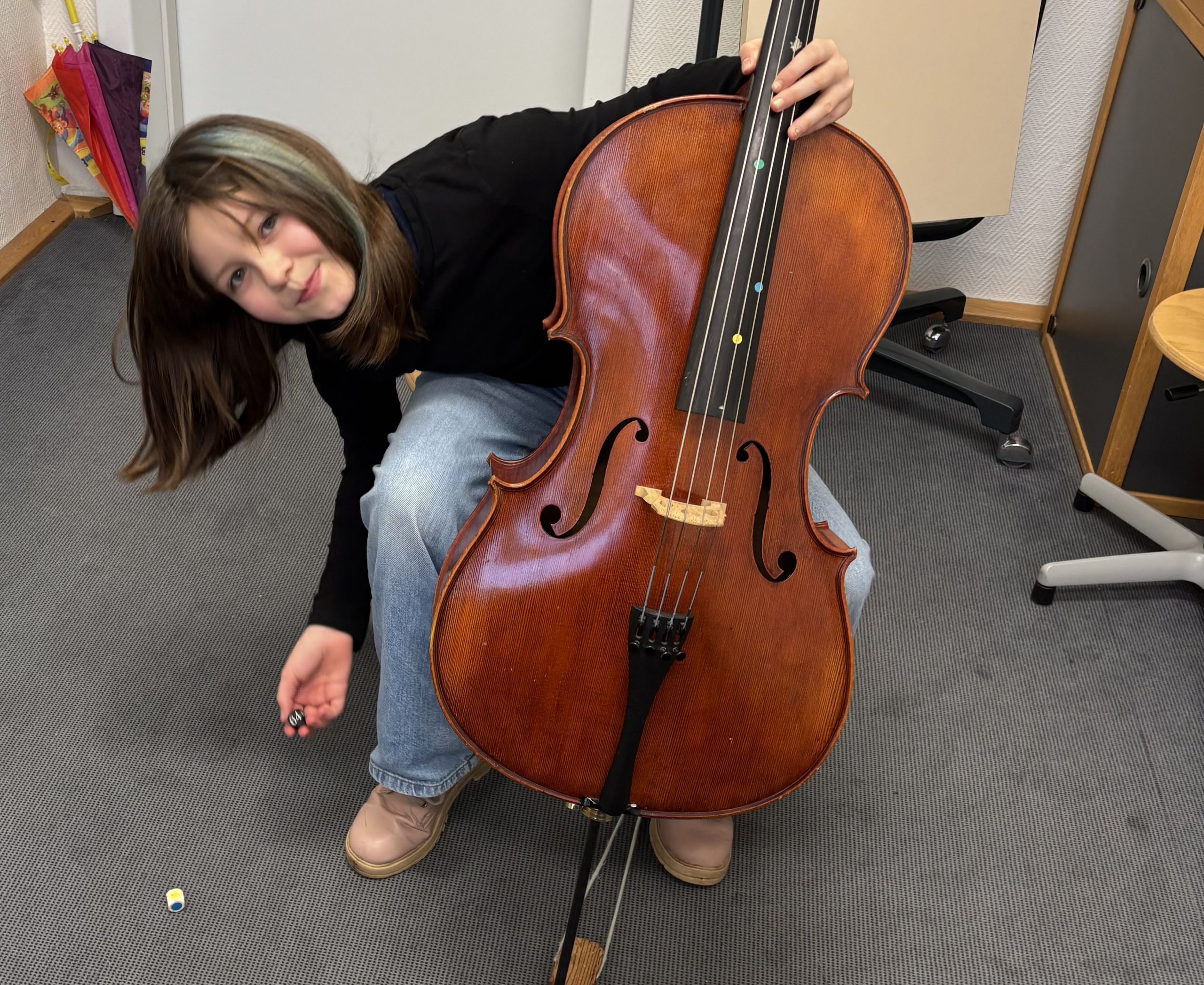 Carla1 braucht noch ein bisschen Hilfe; wir packen gemeinsam das Instrument aus. Da sie noch etwas schüchtern ist, entlocke ich ihr mit „Guten Tag, Herr Bogen“ und „Hallo, kleines Cello, gut geschlafen?“ schon mal ein vorsichtiges Lächeln. In anderen Unterrichtseinheiten lobe ich vielleicht das Griffbrett, weil es so glatt, oder den Steg, weil er so schön gerade ist. Im Laufe der Zeit benenne ich so die wesentlichen Teile von Cello und Bogen und gebe Carla Zeit, anzukommen und ein wenig aufzutauen.